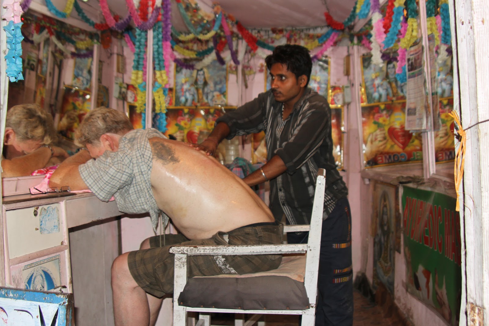 Noch bevor Willi überhaupt die geringste Chance hat, geht die Rasur übergangslos in eine Ganzkörpermassage über. Willi hat keine Chance zu reagieren. Der „Kleine“ hüpft auf ihn drauf, drückt ihm den Kopf nach vorne und schon geht es los mit einer Kopf und Nackenmassage. Der Vorhang wird zugezogen. Die Schaulustigen müssen draußen bleiben.